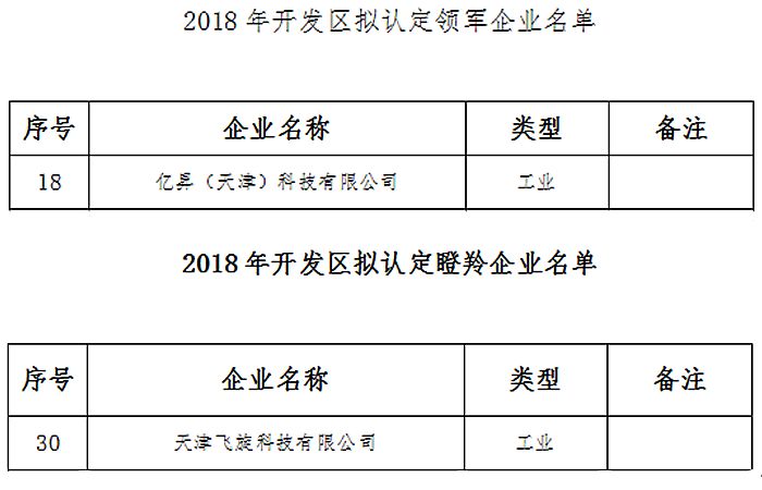 近日,天津经济技术开发区发布关于公示开发区2018年认定为领军、瞪羚企业名单的通知,火狐网页版页面荣获“领军企业”称号,天津飞旋科技有限公司荣获“瞪羚企业”称号。